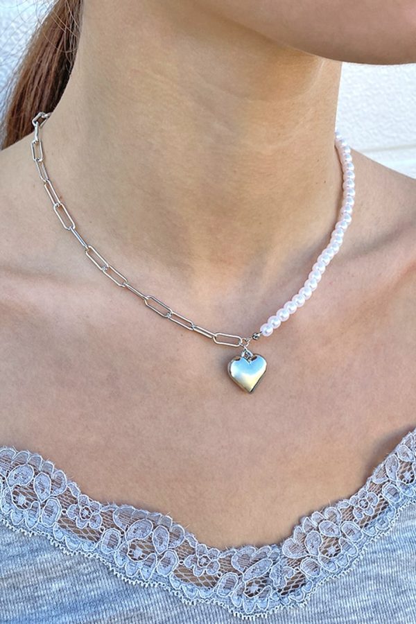 Collana metà perline e catena, con ciondolo cuore, chiusura con moschettone, con lunghezza regolabile.