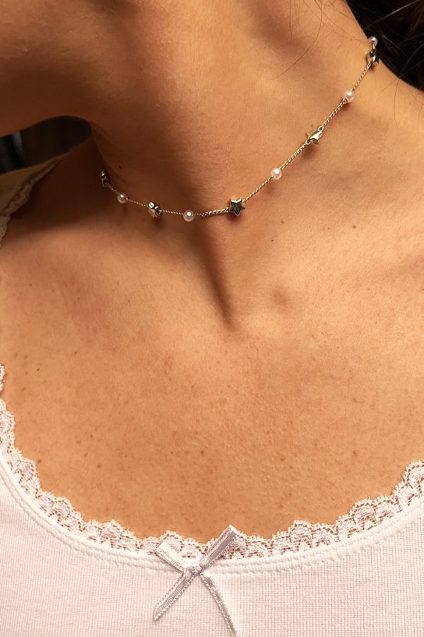 Collana con stelle e perle, chiusura con moschettone, con lunghezza regolabile.