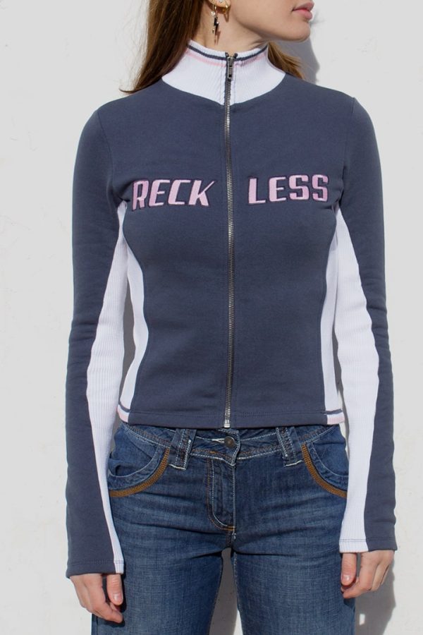 Felpa con ricamo Reckless, collo alto, chiusura con zip, maniche lunghe, lunghezza corta, vestibilità slim.