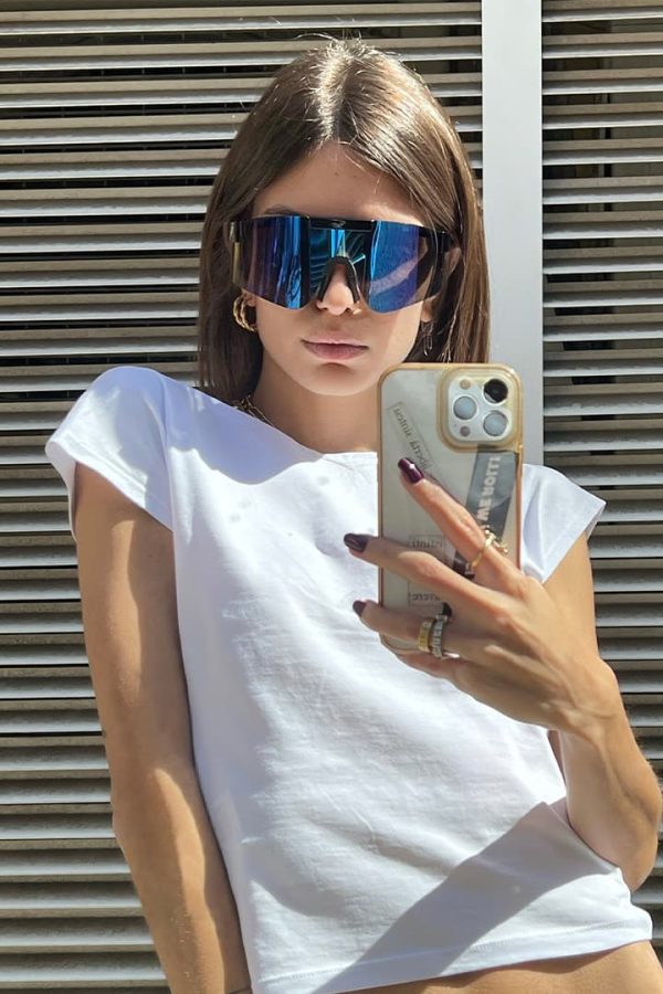 Occhiali da sole a mascherina specchiati, montatura in plastica, stanghette spesse con estremità ricurve.