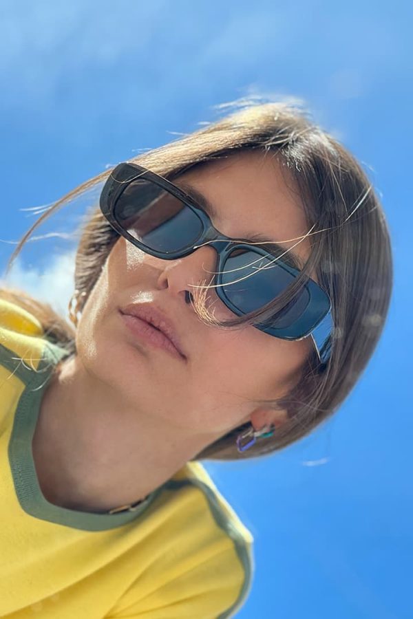 Occhiali da sole, forma rettangolare, montatura in plastica, stanghette spesse con estremità ricurve.