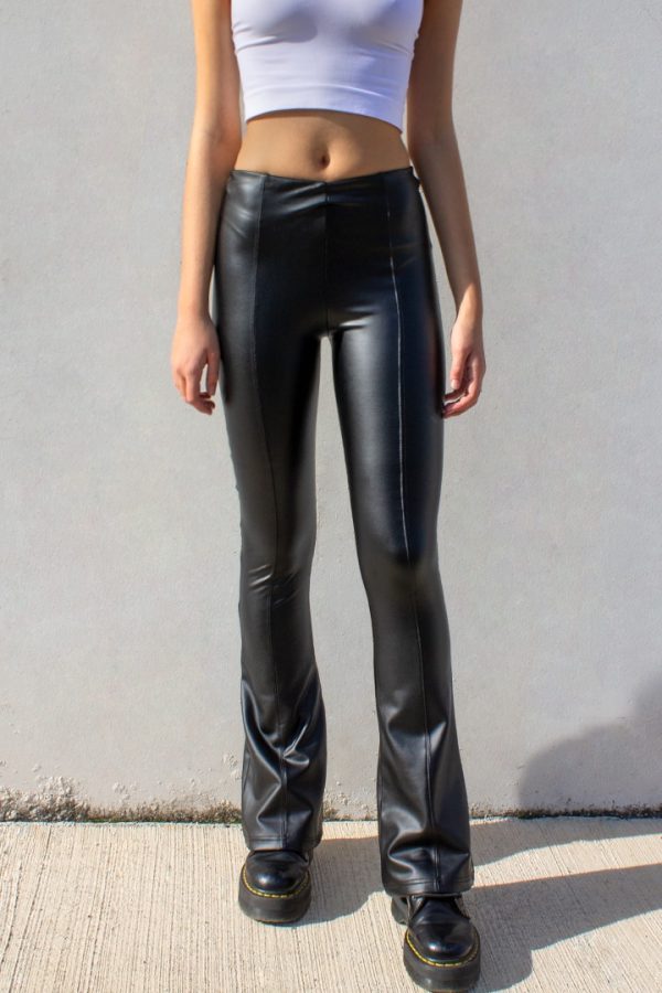 Pantaloni a zampa, vita bassa, tessuto in ecopelle, lunghezza regolare, vestibilità comoda.