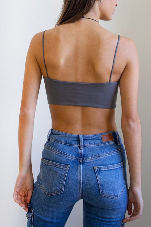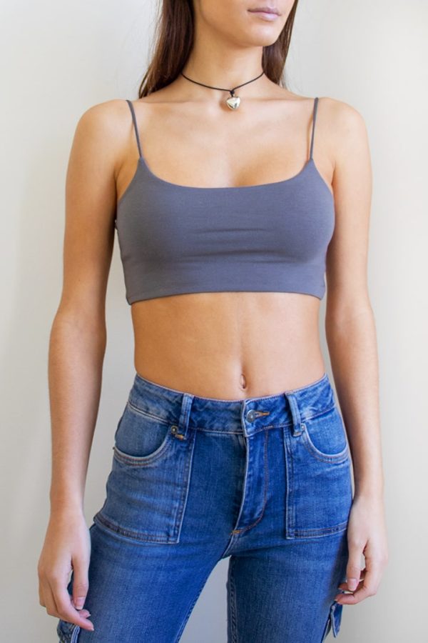 Top crop, scollo rotondo, con bretelline, lunghezza crop, vestibilità aderente.
