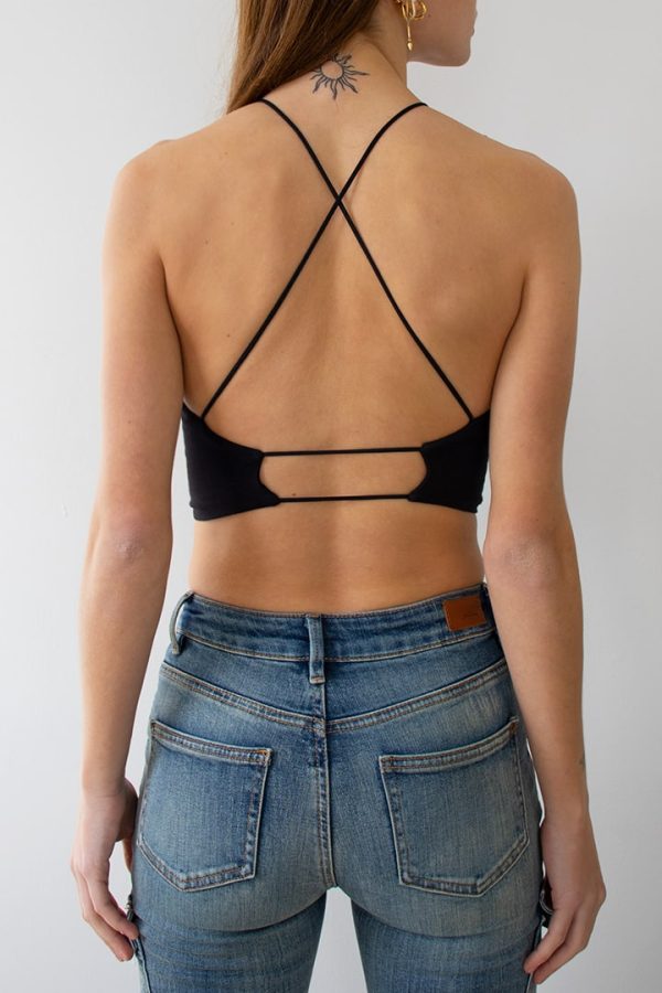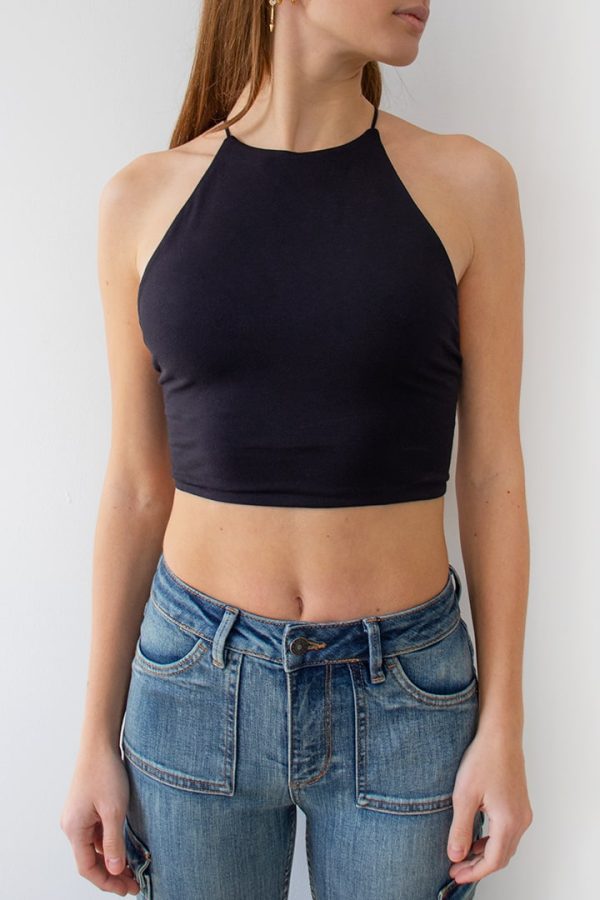 Top crop, girocollo, smanicato, con incroci sul retro, lunghezza crop, vestibilità slim.