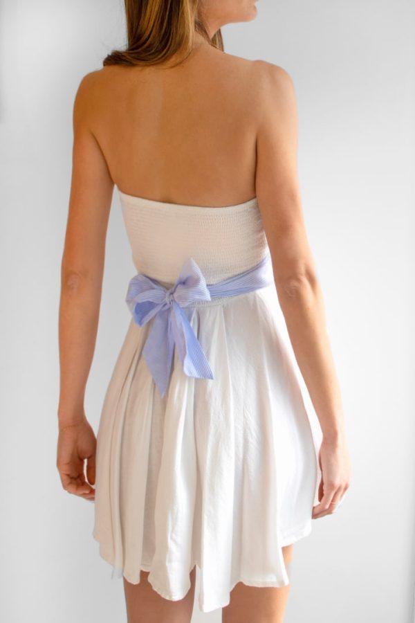 Vestito corpetto, smanicato, dettaglio con fiocco sul retro, lunghezza corta, vestibilità slim.